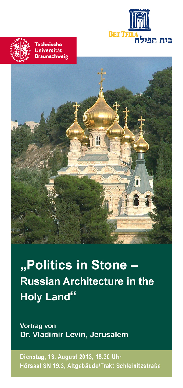 Mehr als Zwiebeltürmchen und vergoldete Kuppeln... In seinem Vortrag nimmt Dr. Levin das Publikum mit zu den zahlreichen sakralen aber auch profanen Bauwerken, die russische Auftraggeber im Heiligen Land zwischen der Mitte des 19. und dem Beginn des 20. Jahrhunderts errichtet haben. Hinter den Fassaden sucht er Zusammenhänge zwischen Bauaktivität und politischen Zielen aufzuzeigen und somit die Rolle der russischen Architektur im politisch-ideologischen Wettstreit mit den europäischen Mächten, anderen christlichen Kirchen sowie auch mit den orthodoxen Mitstreitern in Palästina darzustellen.
